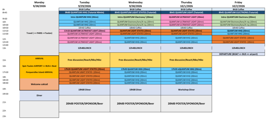 As part of the Port-Cros National Park, the island is renowned for its preserved natural landscapes, crystal-clear waters, vineyards, and tranquil atmosphere free from urban distraction. This unique environment fosters focused discussions and creative thinking, making Porquerolles an ideal venue for the Strong Field Quantum Optics Workshop, where cutting-edge science meets clarity, openness, and inspiration.